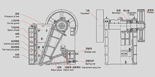 颚式破碎机主要有机架、偏心轴、大皮带轮、飞轮、动鄂、侧护板、肘板、肘板后座、调隙螺杆、复位弹簧、固定鄂板与活动鄂板等组成,其中肘板还起到保险作用。